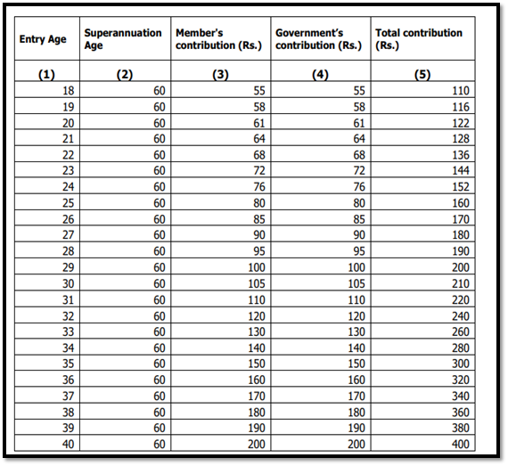 मानधन योजना के तहत 60 की उम्र में 3000 रु की मासिक पेंशन प्रदान की जाएगी तथा उसकी मृत्यु की स्थिति में परिवार के सदस्य को आधा यानि 1500 की राशि मिलती रहेगी. इसके योजना में पंजीकरण के लिए लाभुक के खाते से प्रत्येक महिना उम्र के हिसाब से 55 से लेकर 200 तक की राशि की कटौती मेंडेट के तहत् की जाएगी अगर आपके खाते में अप्रयाप्त राशि पाई गई तो 10 रु की पेनल्टी की जाएगी. लाभुक के अंशदान के साथ ही केंद्र सरकार भी राशि आपके खाते में जमा करेगी. कटौती की राशि निचे दी गई तालिका में दी गई है.
